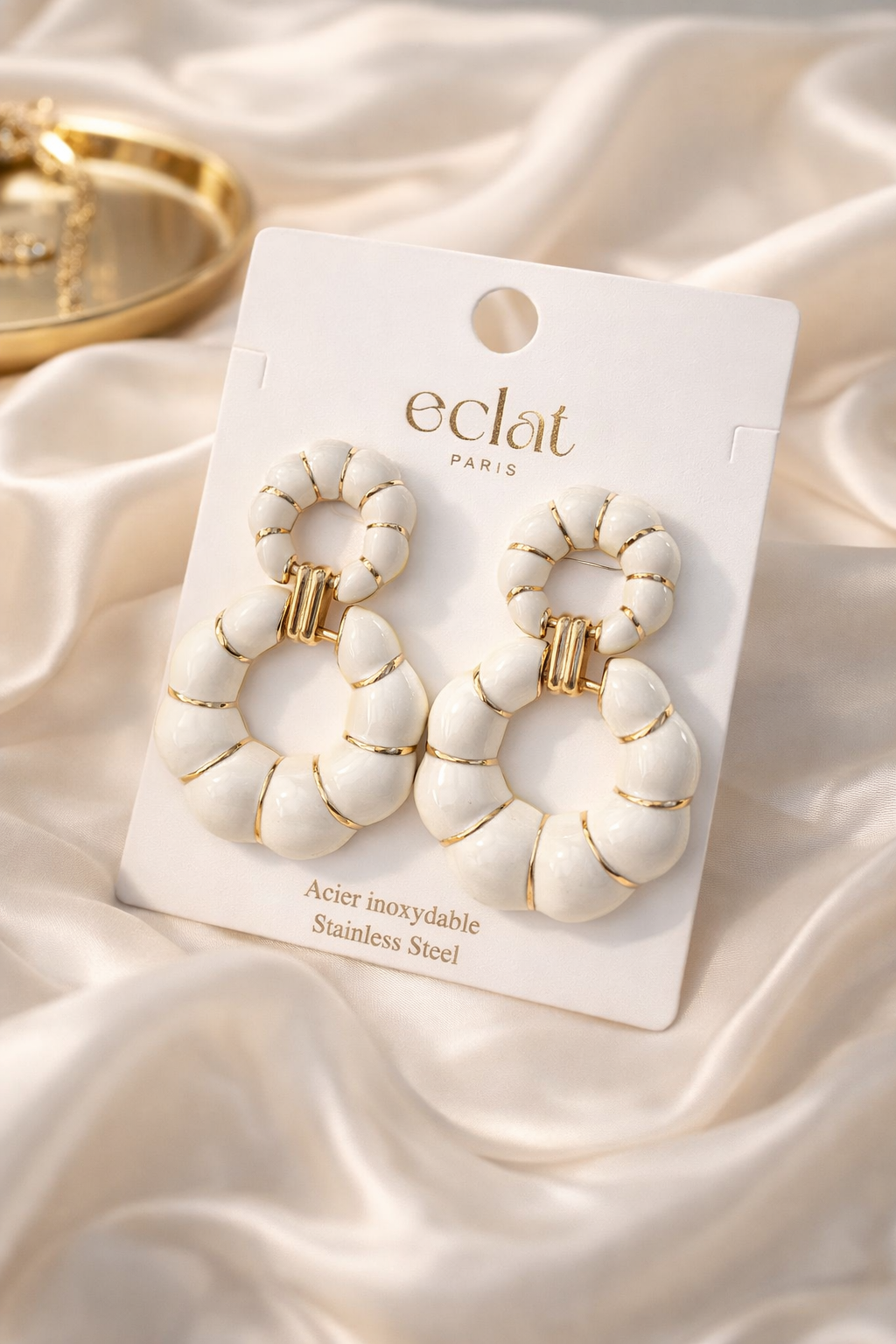 Ces boucles d’oreilles Éclat Paris sont une valeur sûre pour la revente. Leur design double anneau, très tendance, associé à un émaillage blanc lumineux et à des détails dorés élégants, séduit immédiatement en vitrine comme sur les réseaux. Fabriquées en acier inoxydable, elles répondent aux attentes des clientes : résistantes, durables et confortables, sans entretien particulier. Leur style chic mais facile à porter permet de toucher une large clientèle, du quotidien aux occasions plus habillées.